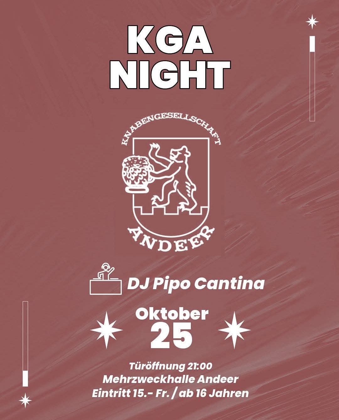 Am 25 Oktober ist in Andeer wieder mal die KGA Night. Die geilste Freinacht im Kanton von der geilsten Knabengesellschaft.